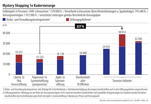 Die Anbieter im 1e-Markt wurden mit einer verdeckten Ausschreibung für ein Unternehmen mit sechs Kadermitarbeitern getestet. Das Mystery Shopping zeigt grosse Differenzen bei den Risiko- und Verwaltungskosten sowie den Stiftungsgebühren, die bei einzelnen Anbietern weitere Fixkosten oder kapitalabhängige Gebühren enthalten. Zudem gilt es, allfällig zusätzliche Vermögensverwaltungskosten unter die Lupe zu nehmen.